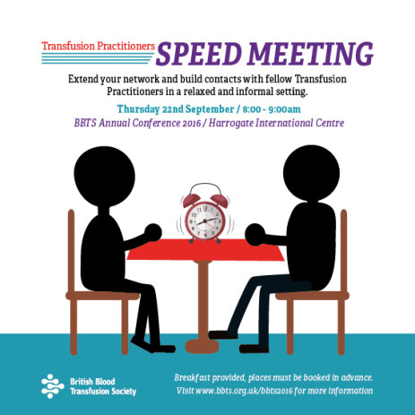 An opportunity for Transfusion Practitioners and other transfusion colleagues attending the BBTS Annual Conference to meet, make a contact and find common interests with others working in transfusion. Like speed dating there will be short time for each encounter before moving on to chat to the next person.