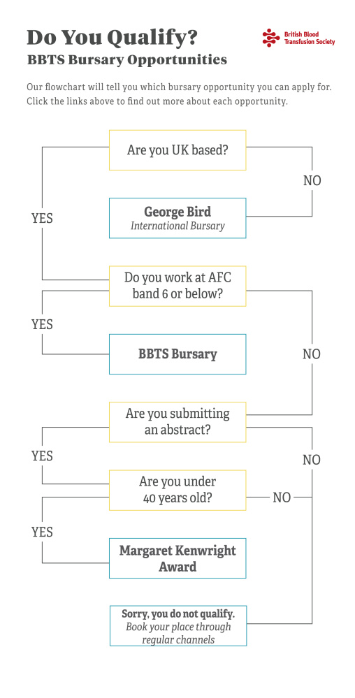 As part of our commitment to supporting the transfusion community and advancing the study of blood transfusion, BBTS offer a number of financially assisted places to attend our Annual Conference. Find out if you qualify using the flowchart below.